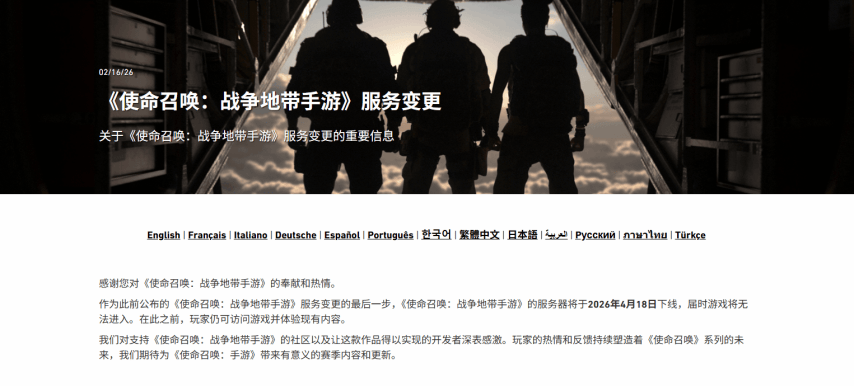 2月17日,动视正式宣布旗下的《使命召唤:战区》手游将于2026年4月17日正式停服,服务器届时关闭。