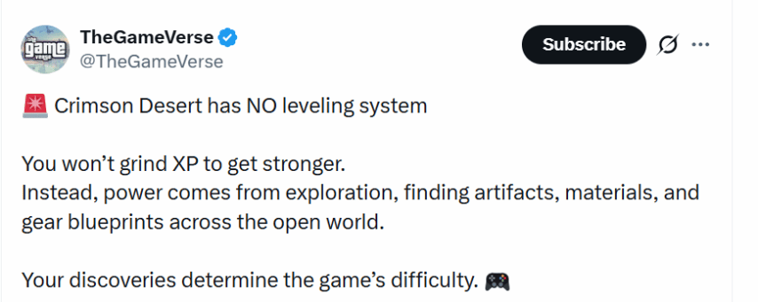 不过,根据之前游戏博主TheGameVerse的爆料,《红色沙漠》将彻底放弃等级系统。玩家不用刷经验升级,角色的实力全部来自探索:你在游戏里找到的东西越多,游戏的难度也会跟着变化。