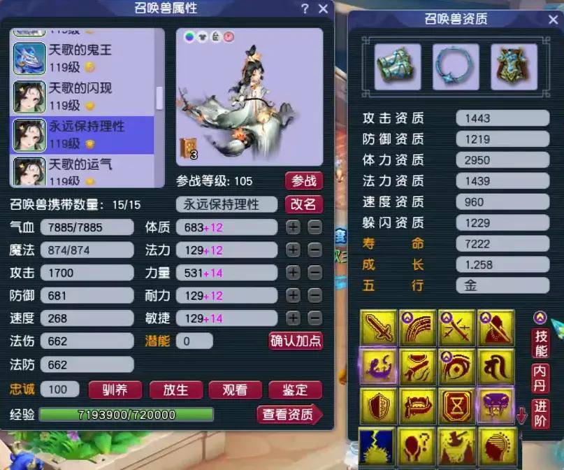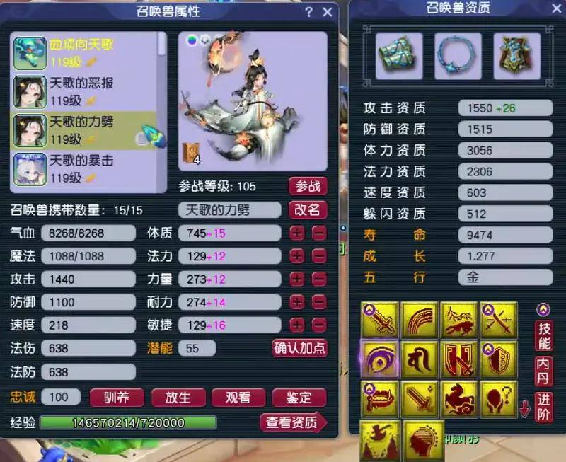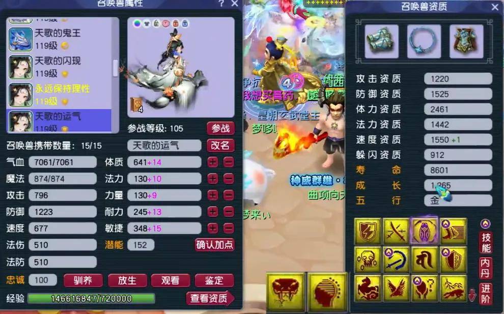 第三只召唤兽为14技能净台神马善恶画魂,完美资质双超级技能在手,足以媲美服战召唤兽。