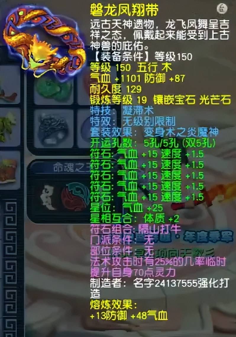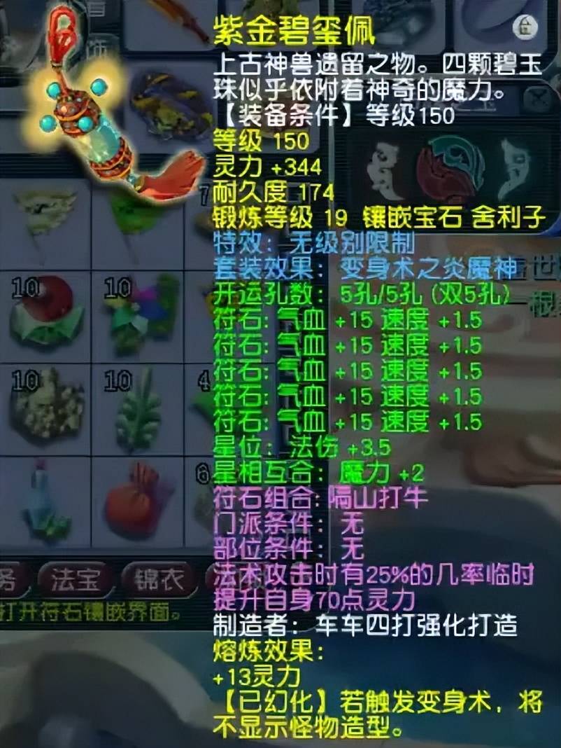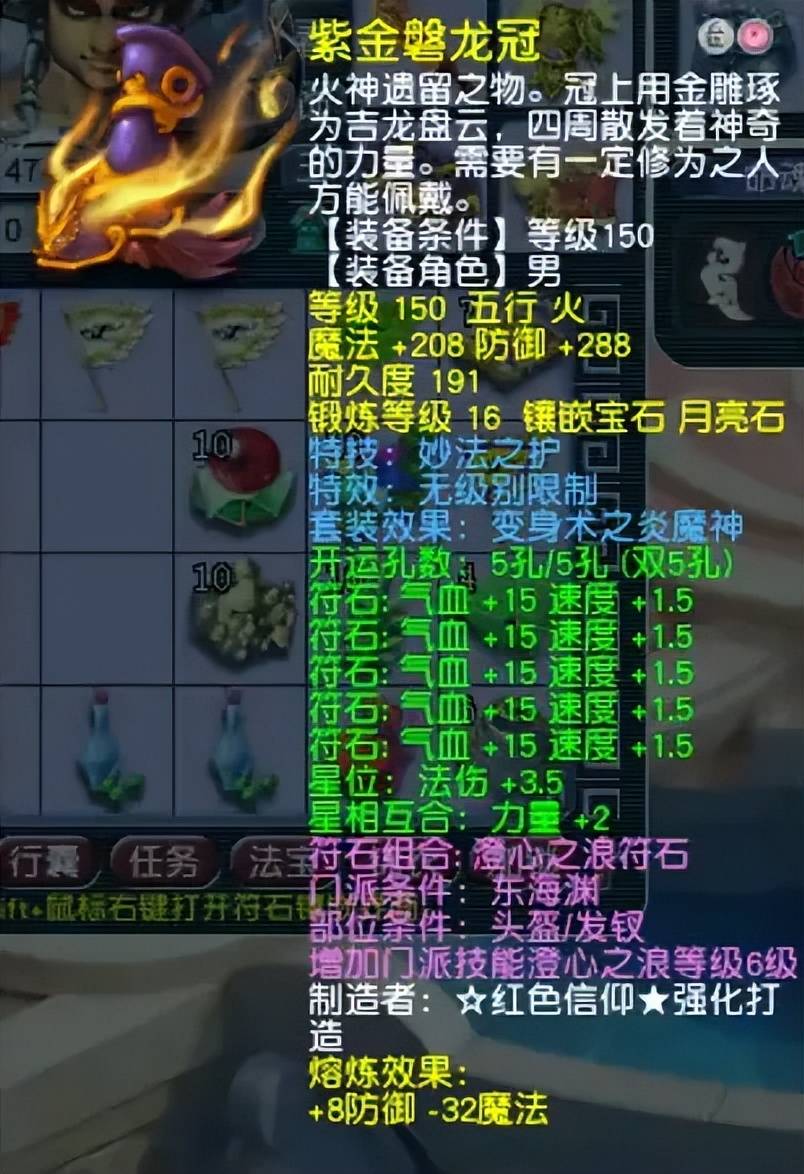 150级无级别妙法头盔,16锻+熔炼总防296。妙法特技的作用是提升法防属性,可以有效克制对手天狗的发挥。