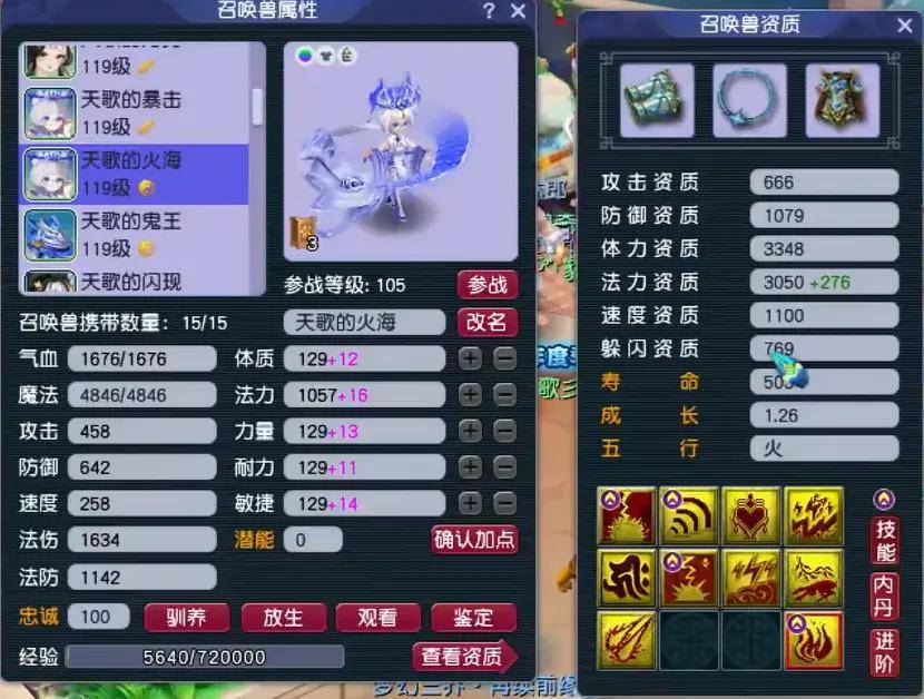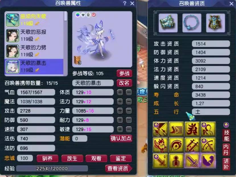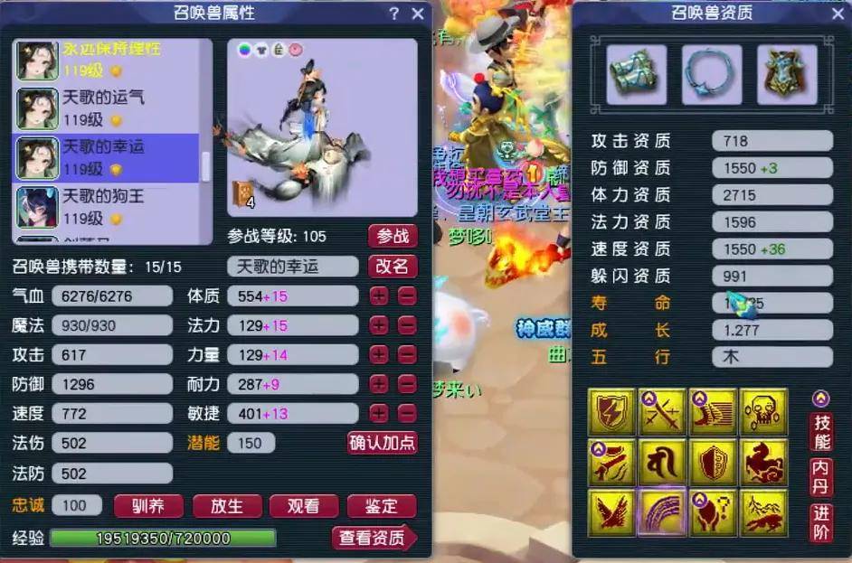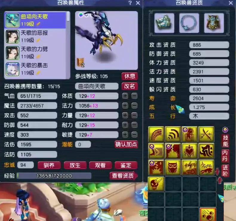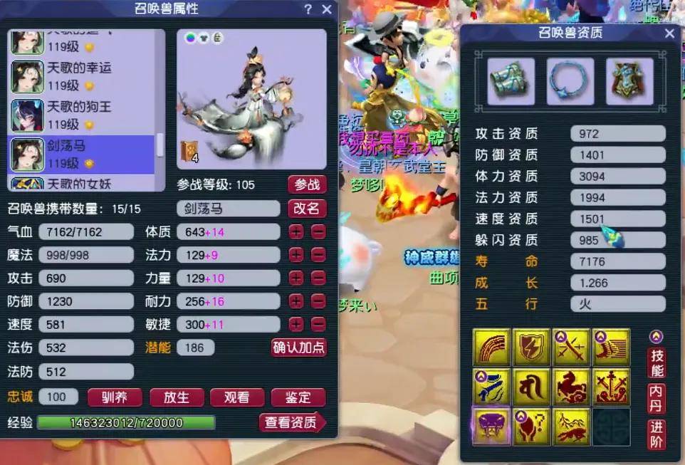 第二只召唤兽为14技能净台神马力劈画魂,全红配置还有超级夜战,适合当首发宠。