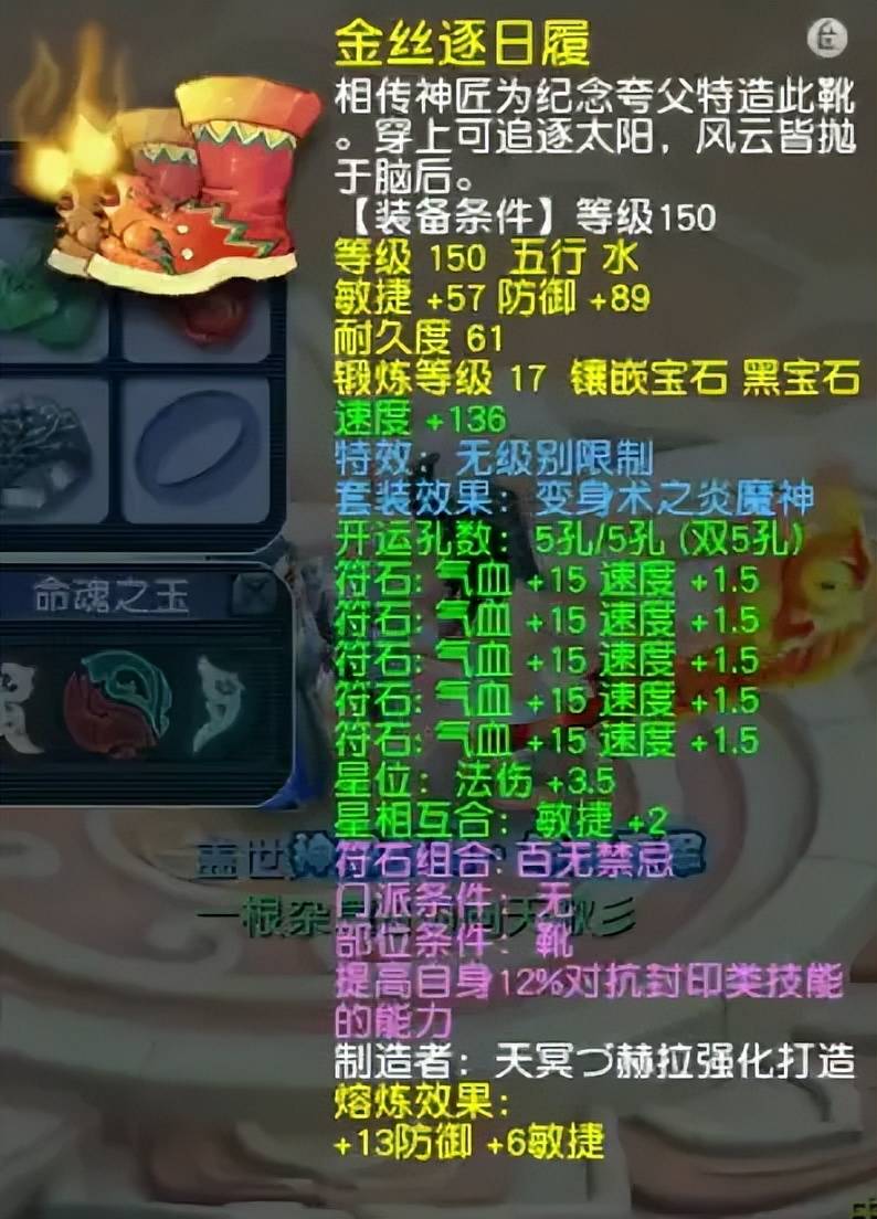 150级无级别鞋子,熔炼后敏捷63、防御102,镶嵌17锻黑宝石。鞋子部位不带特技装,主要看中高额速度加持,以及五孔抗封的优势。