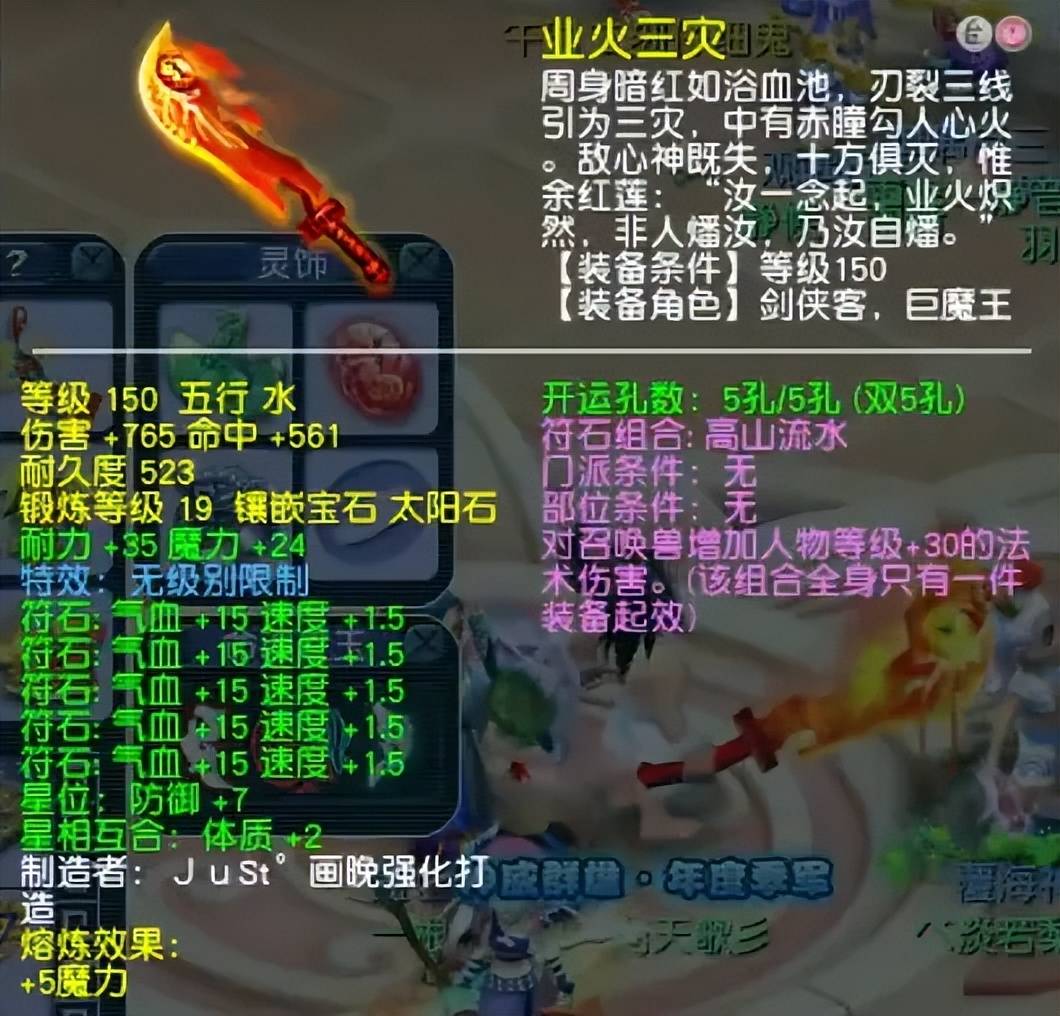 150级无级别刀,熔炼后耐魔双加64,19锻太阳石总法伤加成218。接近非专用极限的初伤和完美双加属性,这就是全服第一X9法系刀的威力。