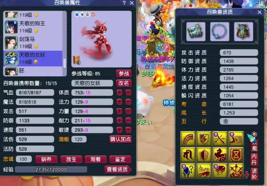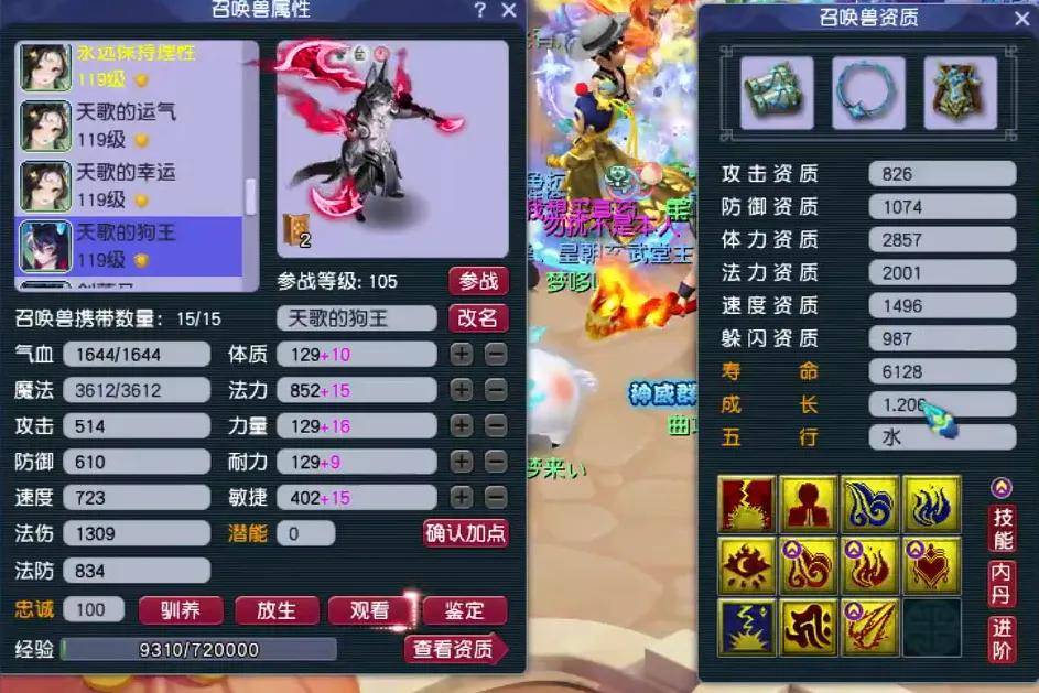 第四只召唤兽为11技能须弥气吞天狗,高速又抗封,很容易出手。