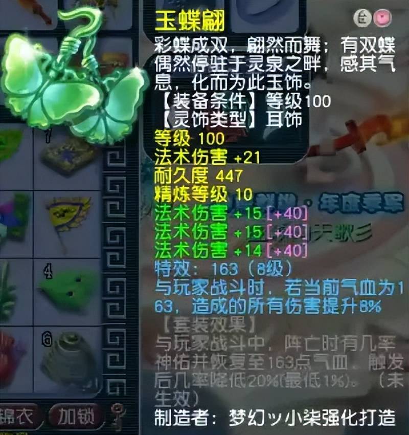 100级四法伤耳饰,上排法伤21爆1,下排法伤共44爆14,离极限属性只差一点。