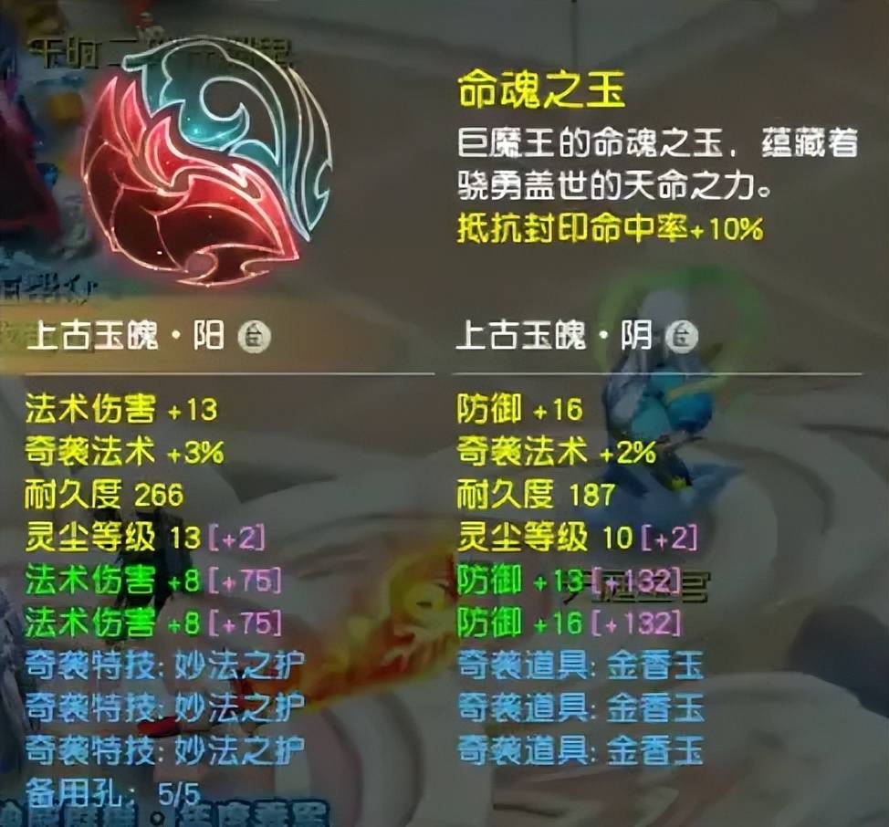 前排玉魄为三法伤,后排玉魄为三防御。分别打了13级、10级五色灵尘,面板属性拉满。