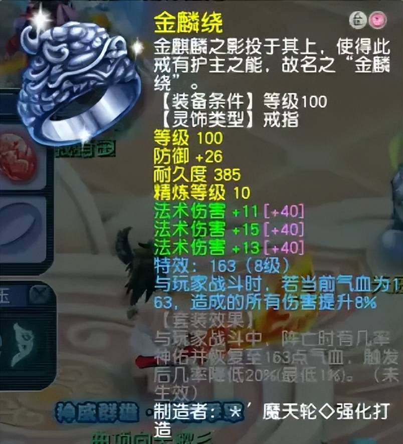100级三法伤戒指,上排防御26爆6,下排法伤共39爆9。