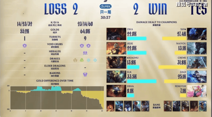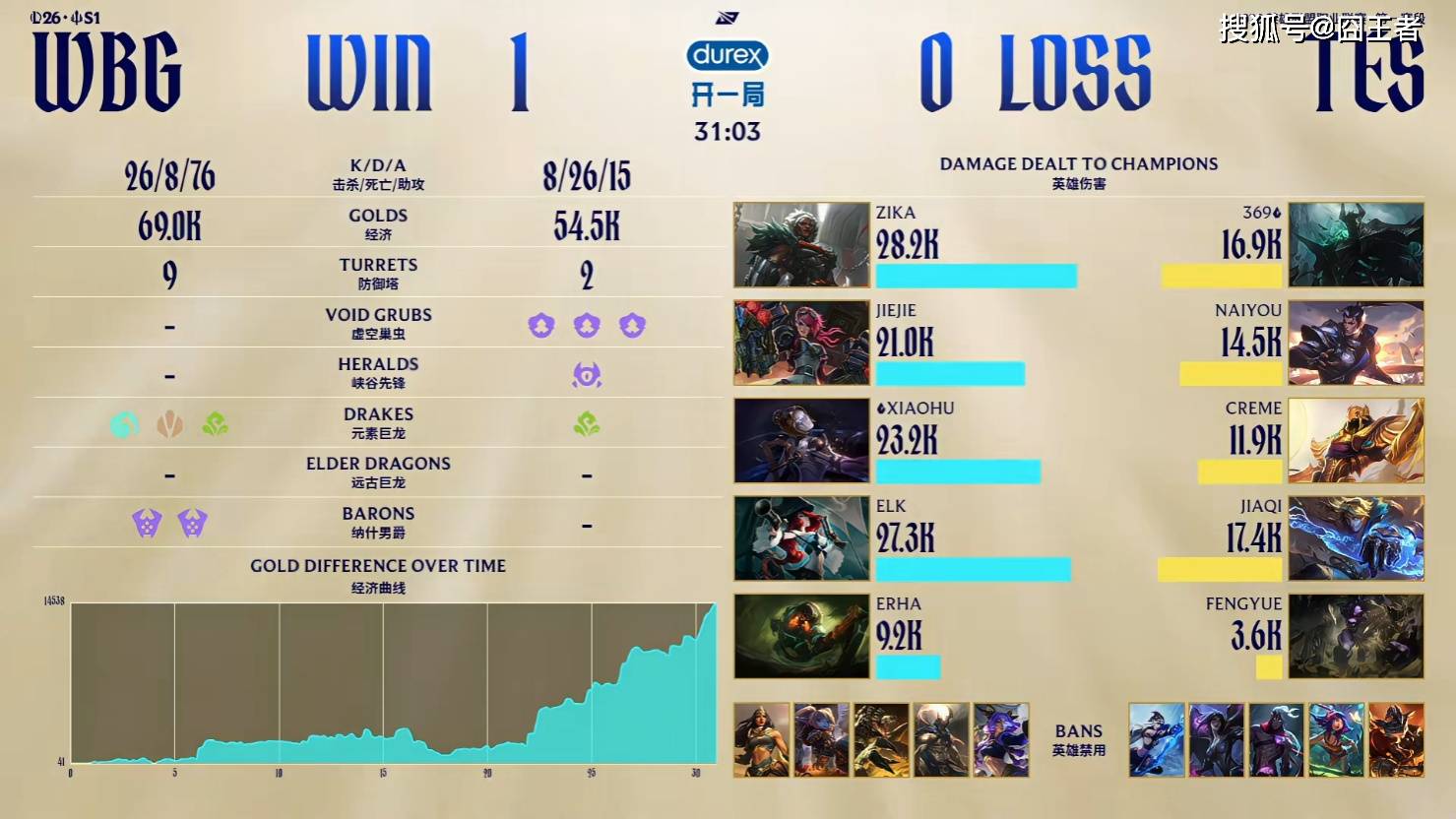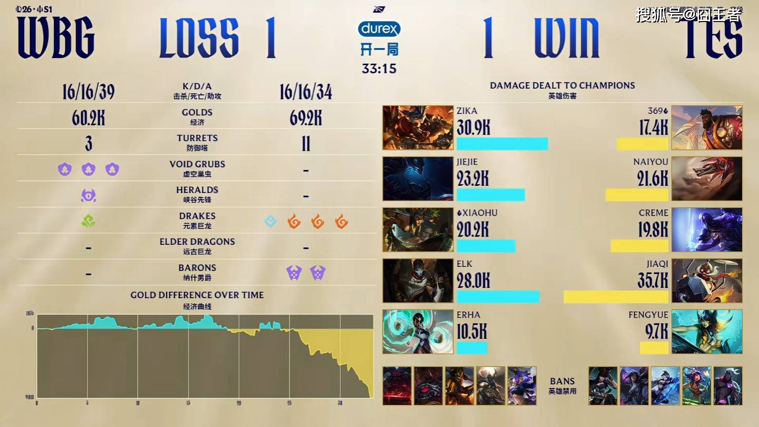 结果第一局比赛,被WBG打成了单方面打碾压局。2分钟:JiaQi面对Jiejie绕后gank闪现躲q换掉Erha泰坦;7分钟:双方下路混战Elk女枪连续极限逃生,WBG击杀对方下野辅打出零换三;14分钟:小奶油沙皇连续两波压线过深被WBG野辅抓死;21分钟:TES野辅野区脱节被集火抓死,WBG笑纳大龙;24分钟:双方小龙坑爆发团战,沙皇进场被瞬秒随后女枪配合队友收割拿到三杀;28分钟:TES中路开团但是小奶油沙皇被瞬秒,WBG打出一换四拿到大龙;最终31分03秒,WBG团灭TES,先赢一局!