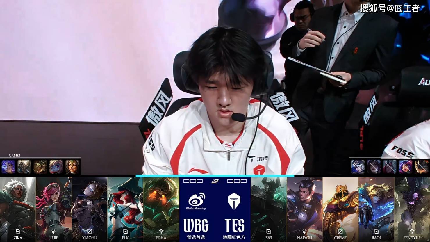第一局比赛,WBG蓝色方,禁用:芸阿娜,潘森,鳄鱼,波比,希维尔,选用:Zika狼母,Jiejie蔚,Xiaohu发条,Elk女枪,Erha泰坦;TES红色方,禁用:兰博,妮蔻,韦鲁斯,卡莎,寒冰,选用:369铁男,Naiyou赵信,Creme沙皇,JiaQiEZ,fengyue牛头