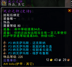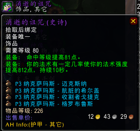 同样是纳克萨玛斯F4共享掉落的消逝诅咒,依旧是我们术士大兄弟的神级饰品了,不夸张的说,按照现在的游戏设定和推进,他可能会一直保值,毕竟在80级的天赋背景下,术士对于命中的需求度依旧会很高,喵叔在这里强势预言一波,消失的诅咒对于术士大兄弟可以带到奥杜尔没问题,应该足以跳跃两个阶段没问题,不知道各位术士大兄弟准备好入手了没有?
