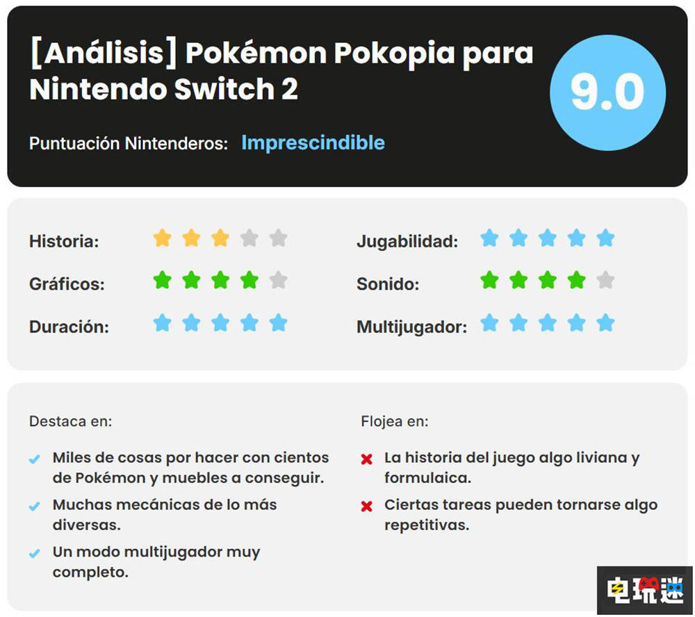 《宝可梦Pokopia》是献给所有喜爱《动物森友会》或《星露谷物语》这类治愈类游戏的宝可梦粉丝的完美之作。游戏呈现了一场内容丰富的冒险,拥有数以百计可收集的家具、极其多样的游戏机制,以及大量可以与之成为朋友的宝可梦。这是该系列中一种全新的衍生作品。不过游戏也同样有着同类型游戏的通病,例如剧情略显单薄,并且模式化,而一些任务也很重复。