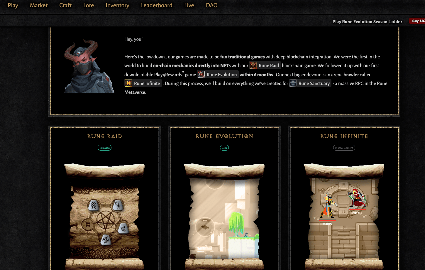 Rune.Game(符文游戏)是“符文元宇宙”的在线之家,一个扎根于黑暗幻想的游戏生态系统。自2021年3月31日推出以来,“符文”引入了一种游戏内货币、治理代币、去中心化的NFT市场,以及适用于桌面和移动设备的游戏以赚取奖励,培养了一个国际社群。“符文”还积极开发了一款3D的“大型多人在线角色扮演游戏”(MMORPG) - 这是一种设置在三维虚拟世界中的多人在线视频游戏。“符文”强调深度的区块链整合,通过直接将链上机制整合到NFT中。“符文”产品中值得注意的项目包括“符文团本”区块链游戏、可下载的“符文进化”游戏以获取奖励,以及竞技场格斗游戏“符文无限”。每个项目都基于“符文庇护所”的基础构建,这是“符文元宇宙”中的一个角色扮演游戏。