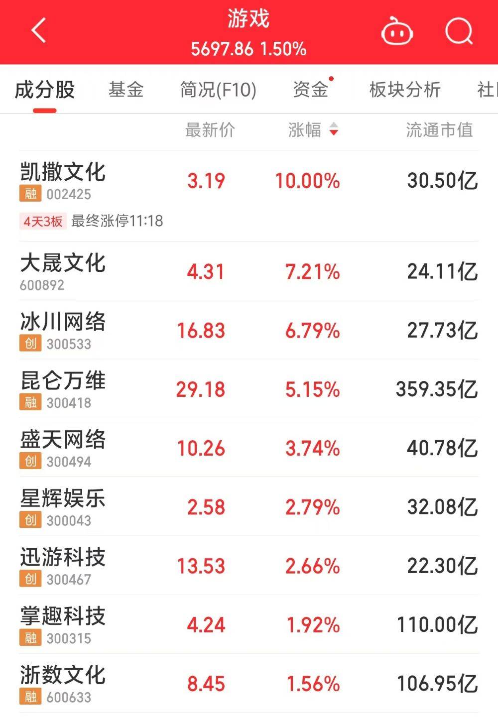 在《黑神话:悟空》热潮的带动下,游戏板块有所上涨。截至今天收盘,凯撒文化(002425.SZ)涨停,大晟文化(600892.SH)涨超7%,冰川网络(300533.SZ)涨超6%,昆仑万维(300418.SZ)涨超5%,星辉娱乐(300043.SZ)、迅游科技(300467.SZ)等个股跟涨。