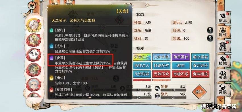 优势:对战高爆发弟子如剑修、书生很有用,天命减对方法宝蓄力和眩晕。道兵功法易获得。