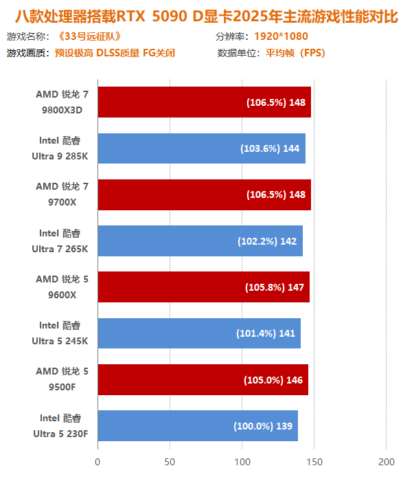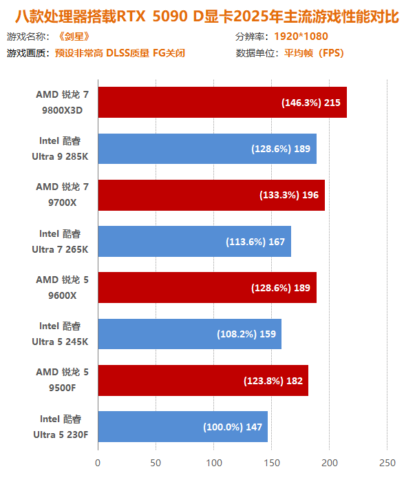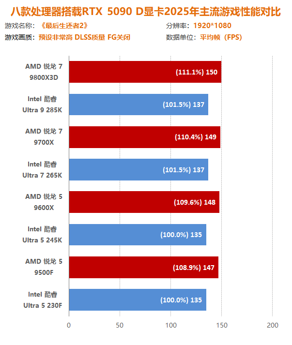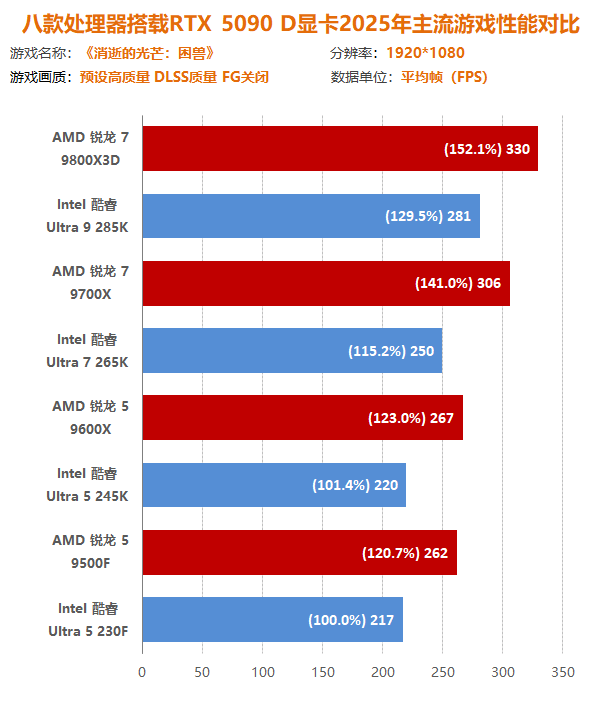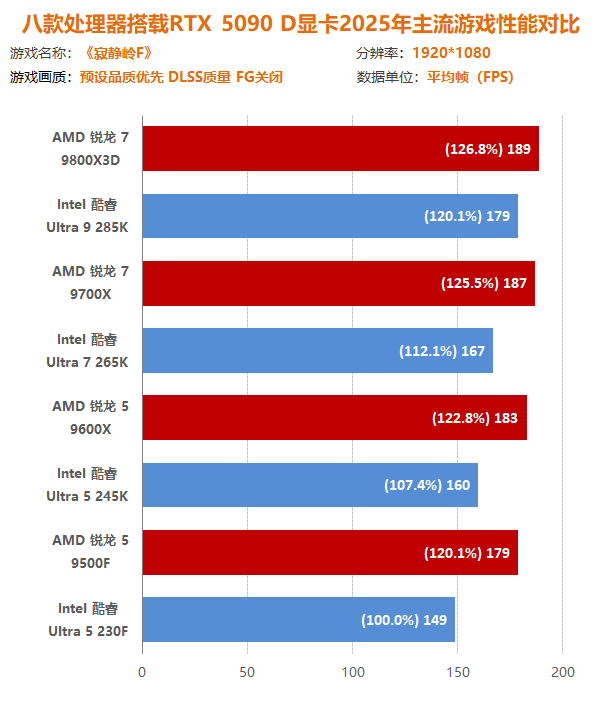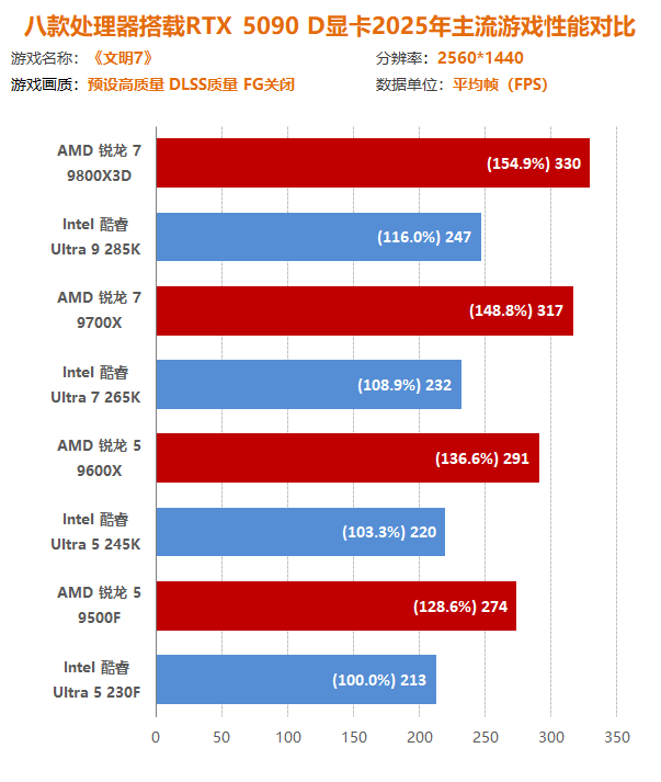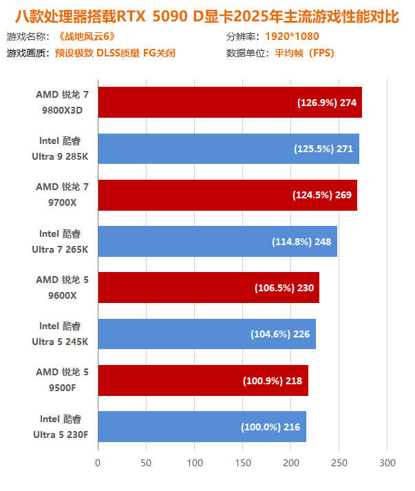 通过本次锐龙7 9800X3D到锐龙5 9500F四款主流/高端的AMD处理器与酷睿Ultra 9 285K到酷睿Ultra 5 230F四款主流/高端的Intel处理器与十二款2025年主流游戏大作交叉对比测试可以发现,在最新一代处理器中,AMD处理器在游戏方面有着得天独厚的优势,不仅可以实现同定位下性能碾压,而且越级吊打也如家常便饭。