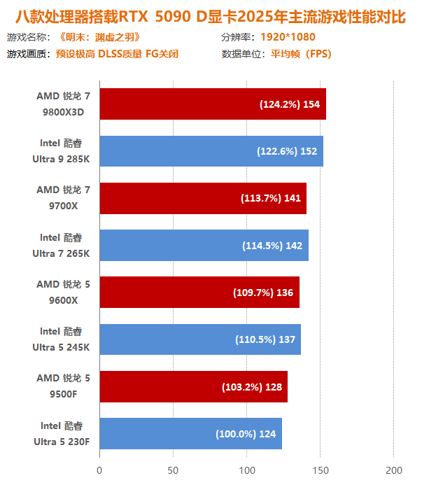 1080P分辨率下,AMD锐龙9000系列处理器的性能仍然全线领先,其中AMD锐龙5 9500F的性能就可超过Intel酷睿 Ultra 7 265K,AMD锐龙7 9700X的性能更是可以直接吊打Intel酷睿Ultra 200S全系。