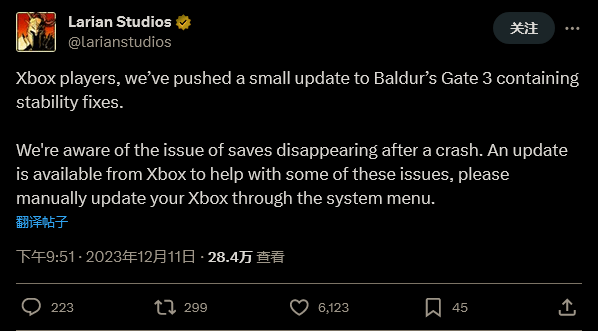 开发商拉瑞安工作室在推特上发布公告宣布,《博德之门3》Xbox Series X|S 版本现已发布一个更新,以解决存档在某些存档下可能会消失的 BUG。