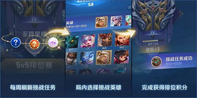 此外, 排位赛中新增英雄挑战任务,每周完成任务即可获得额外的排位积分奖励,积分满100点可额外获得加星,每周最多能参加三次挑战任务。