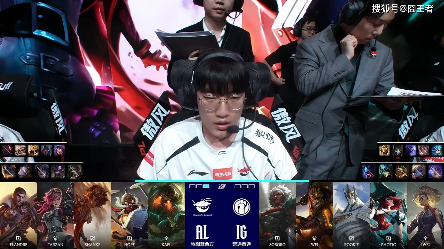 第一局比赛,IG蓝色方,禁用:发条,皇子,潘森,波比,奇亚娜,选用:Soboro格温,Wei赵信,Rookie瑞兹,Photic烬,Jwei巴德;AL红色方,禁用:芸阿娜,蔚,兰博,牛头,飞机,选用:Flandre塞恩,Tarzan纳亚菲利,Shanks沙皇,Hope韦鲁斯,Kael妮蔻