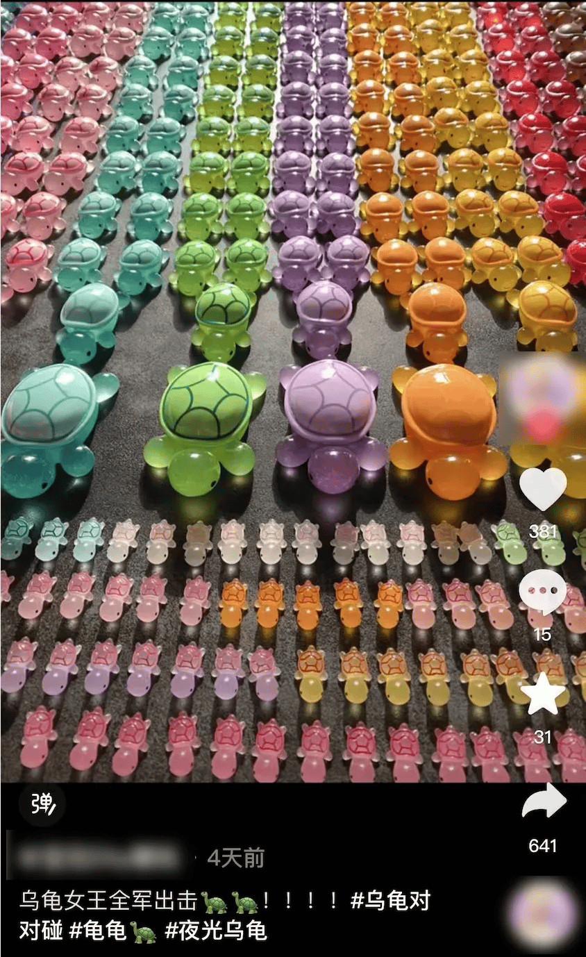 不少玩“乌龟对对碰”的网友都有自己的“乌龟大军”。社交平台上,有网友晒出不同颜色的树脂乌龟“祖孙四代”;还有网友家中乌龟已摆满一地,并表示还有100多个在路上。