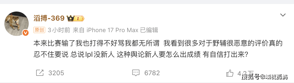 所以在比赛结束后,打野和辅助都被冲了,然而事情并没有结束,在被冲之后,TES的上单369站出来力挺野辅两兄弟,表示观众的恶意太大,这样的舆论环境,难怪LPL没新人。