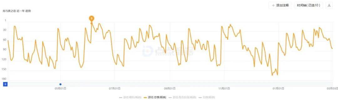 腾讯旗下的老牌女性向产品《光与夜之恋》近一年表现同样稳定,多数时间都排在App Store游戏畅销榜TOP100以内,展现出了较强的长线运营能力。