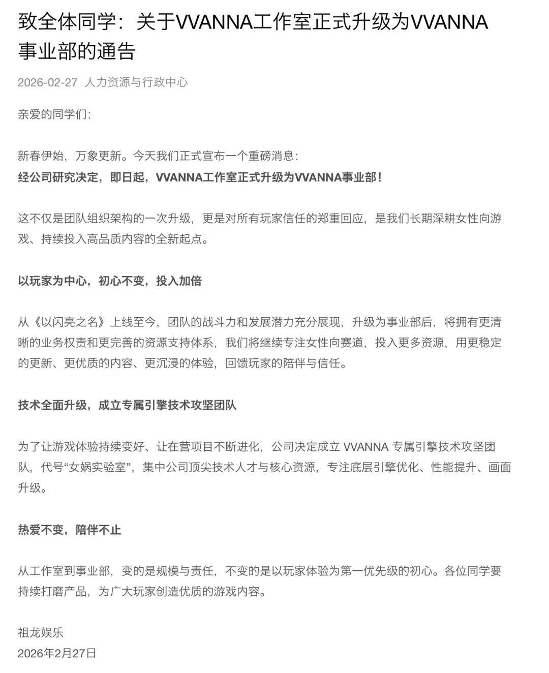 近期动作最大的“参赛者”当属祖龙,2月27日,祖龙发布了一封致全体员工的“关于VVANNA工作室正式升级为VVANNA事业部的通告”,其中写到“此次不仅是团队组织架构的一次升级,更是对所有玩家信任的郑重回应,是我们长期深耕女性向游戏、持续投入高品质内容的全新起点。”