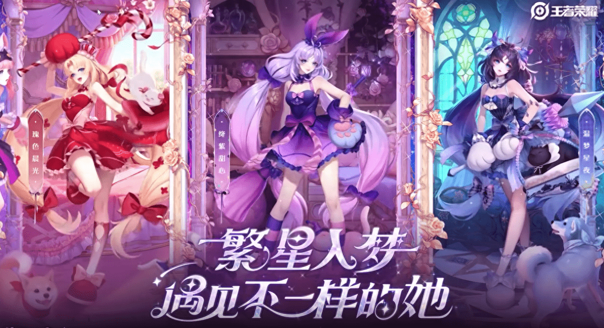 三款星元皮肤分别是绛紫甜心、瑰色晨光、温梦星夜。皮肤除了配色不同外,武器也不同,一个是蝴蝶结装扮的扫帚,一个是玫瑰和蝴蝶装扮的法杖,还有一个是古典优雅的宝石法杖,总之是各有特色。技能特效方面,三款星元效果一样,只是技能的配色不同,猫狗穿插在其中,给人一种热闹非凡的感觉。瑰色晨光有点类似于圣诞皮肤,大乔的装扮略显厚重。