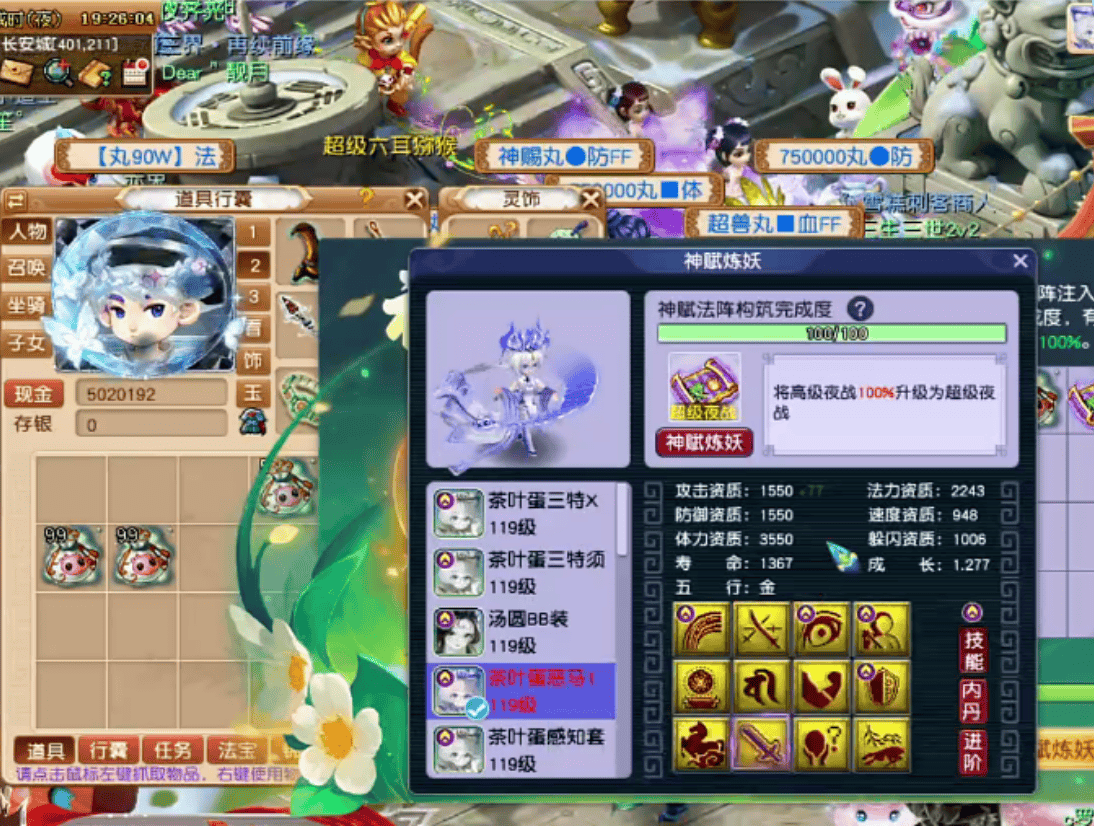 最近,【道法自然】战队的一位老板为了提升召唤兽强度,决定对一只12技能净台涂山瞳进行打书。老板花费大额成本准备了上千个神兜兜,为这只涂山瞳完成了100%法阵完成度,并用超级夜战兽诀覆盖了原有的高级技能。至此,这只涂山瞳不仅坐拥三大特殊技能,还有两本超级兽诀加持。面对普通的脆皮单位,有几率完成一刀斩杀,输出十分给力!