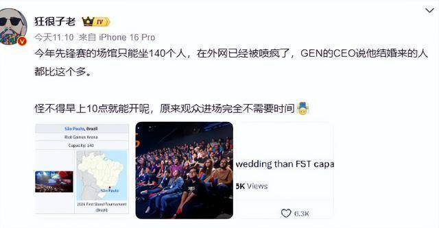 不过看到先锋赛的场馆曝光之后,舆论起飞了,140个人的场馆,拳头官方是认真的吗?那么远跑到巴西,结果这么小的场馆,难怪GEN高层都吐槽,还没有我婚礼的人多。