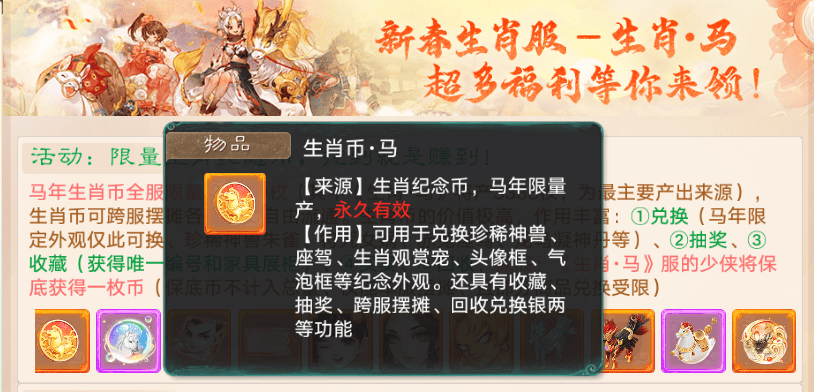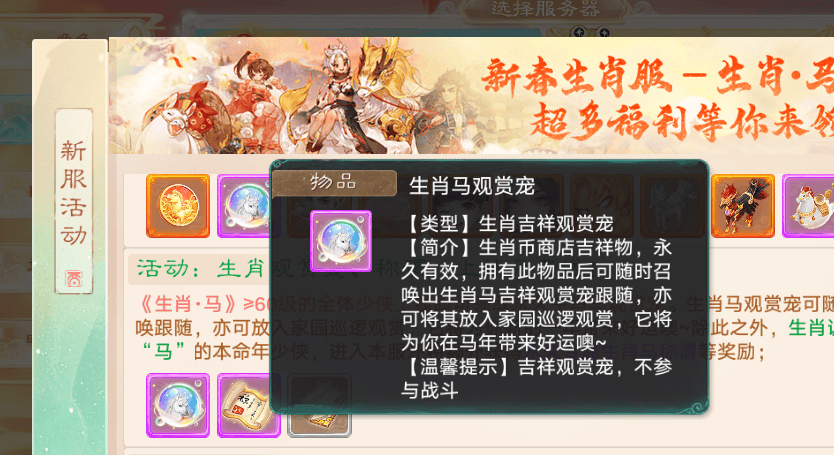生肖马服务器的兄弟们,只要等级≥60级,就能领取永久生肖马观赏宠,如果你属相今年本命年是生肖马,生肖认证“马”的玩家,在本服还能获得永久专属生肖马称谓哦~