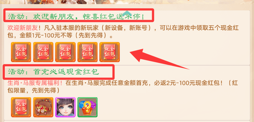 入驻生肖马新服的玩家,在游戏中可以领取到五个现金红包,这个叶子猪前两天已经帮大家测试过了,真实有效,我已经领取过了。在马服任意首充,也必反2元-100元现金红包,蚊子腿再小也是肉,有红包为什么不拿呢?