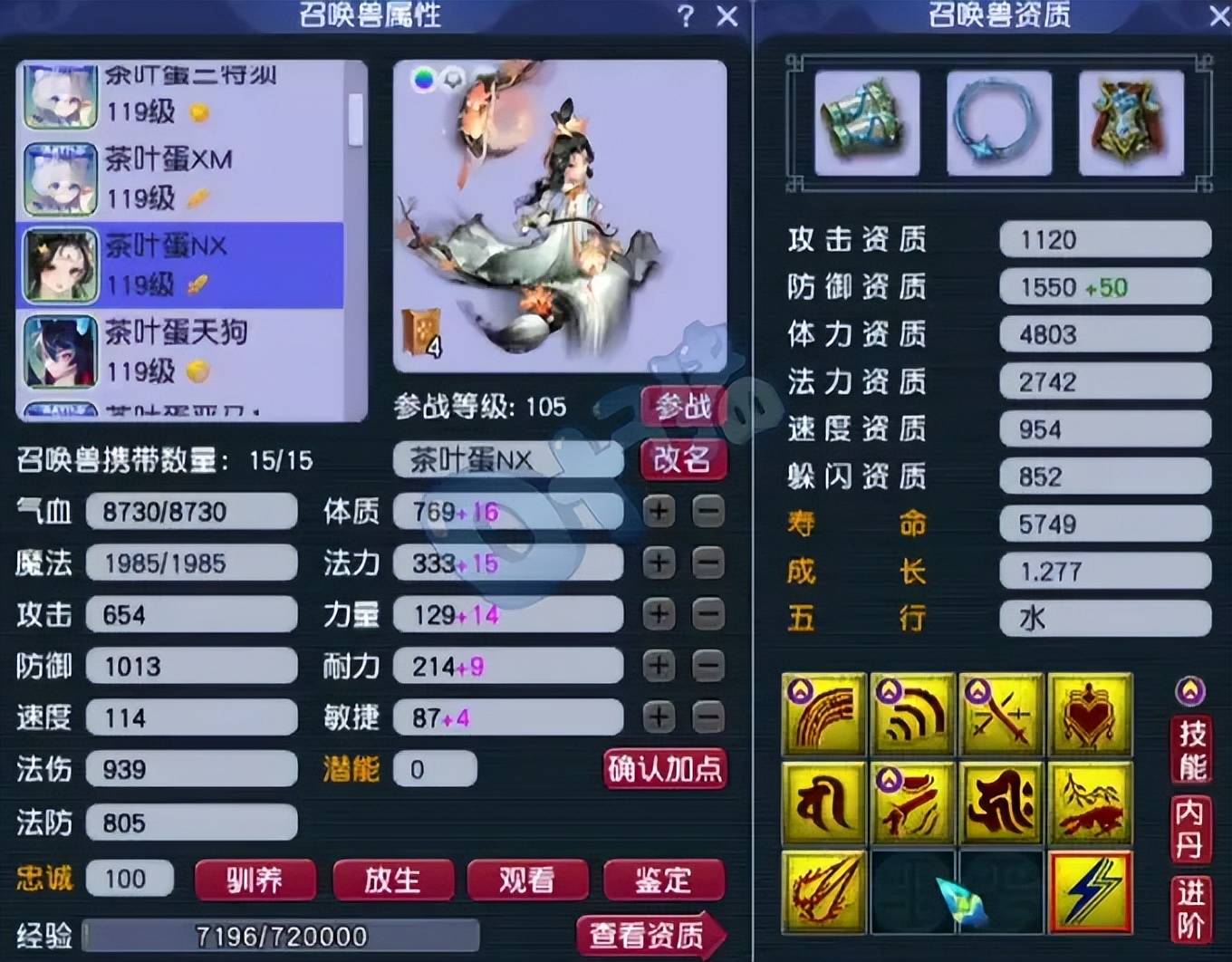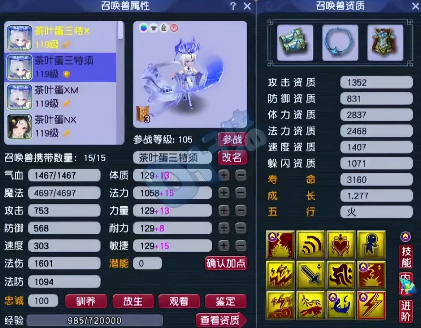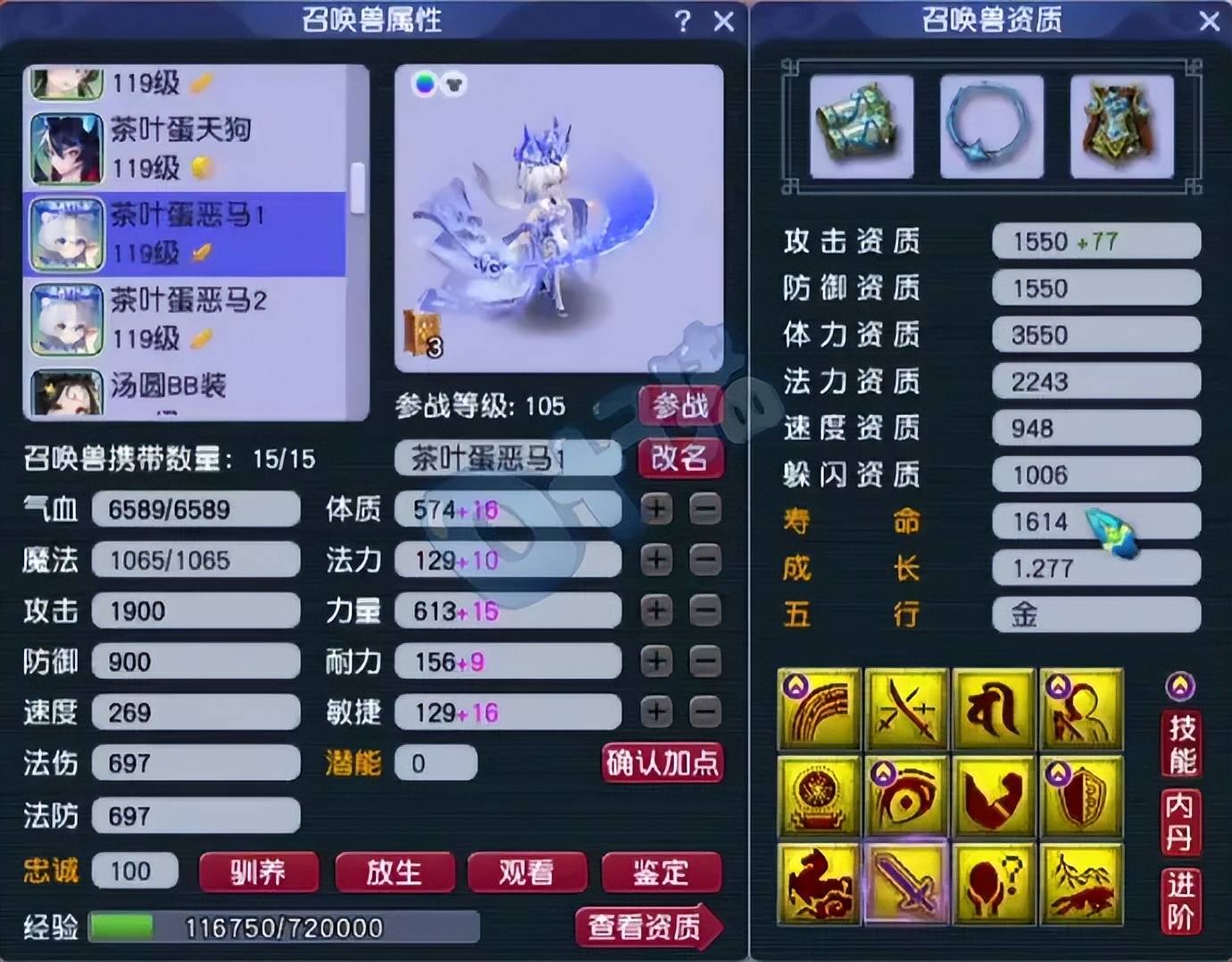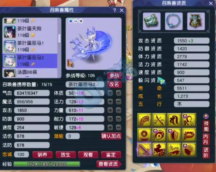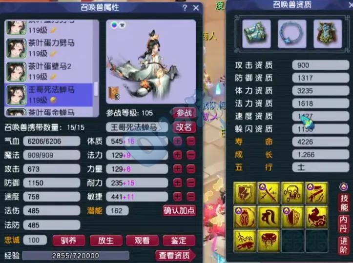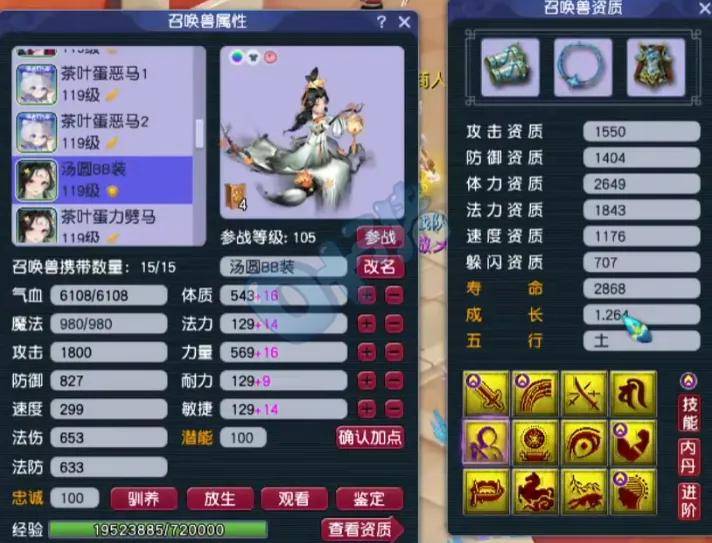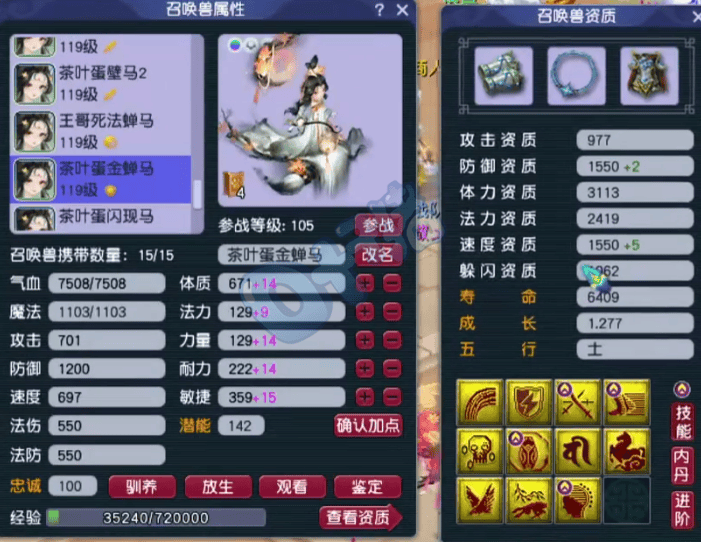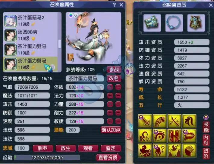 第六、第七只召唤兽为12技能净台神马画魂,攻资和成长都完美,适合当首发宠。