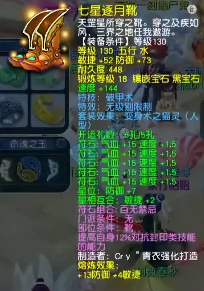 130级无级别破甲鞋子,熔炼后敏捷56、防御86,镶嵌18锻黑宝石。破甲可减少目标的物防属性,配合己方输出点可提升点杀成功率。