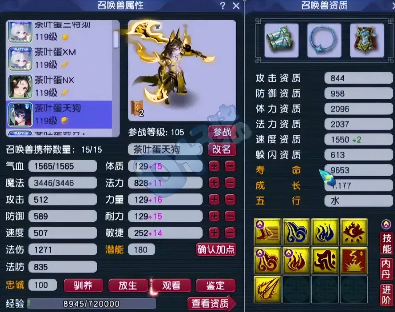 第二只召唤兽为9技能须弥万象天狗,速资拉满保出手,输出非常爆炸。