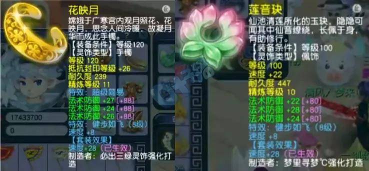 后排灵饰为六法防。手镯上排抗封26爆2,下排法防共77爆5;佩饰上排速度22爆6,下排法防共74爆14。