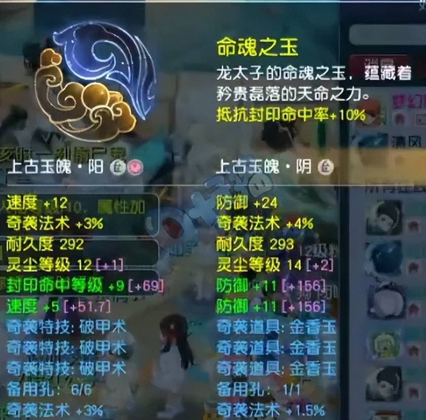 前排玉魄是双速度一封印带3%奇袭法术几率,后排玉魄是三防御带1.5%奇袭法术几率。分别打了12级、14级的五色灵尘,奇袭属性极高。