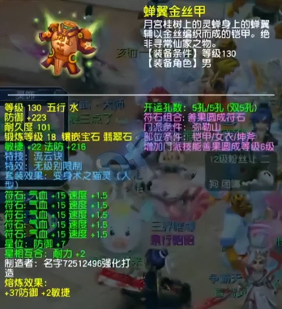 130级无级别流云男衣,熔炼后防御260、单加24敏,18锻翡翠石。流云能够提升己方单人的速度值,可以更好抢夺一速的优势。