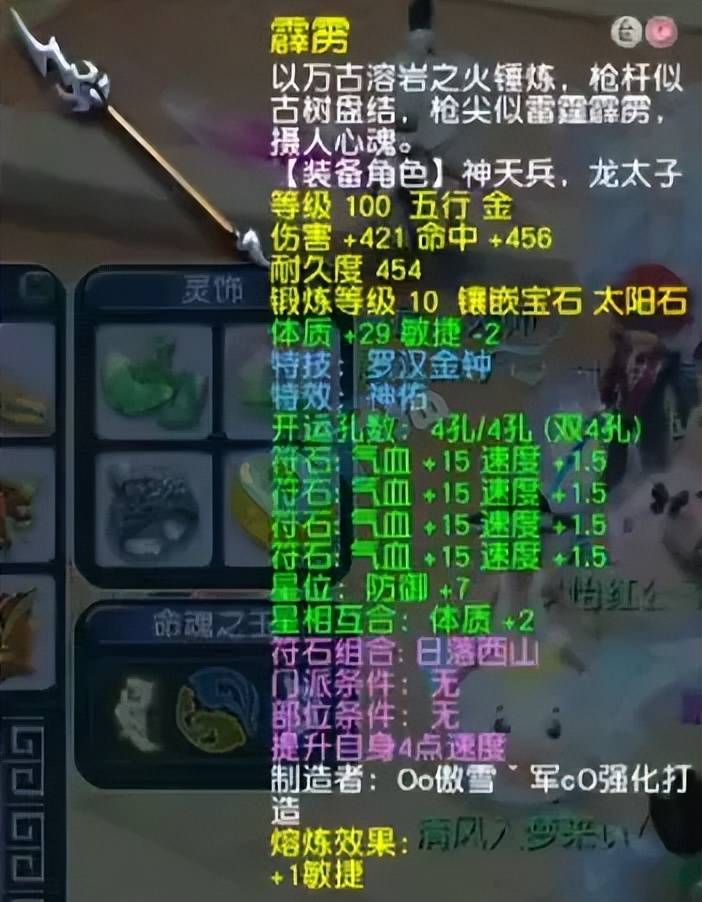 100级神佑罗汉枪,原始伤害376点、单加29体。这是身上唯一大特技,可以减免对手法伤输出。
