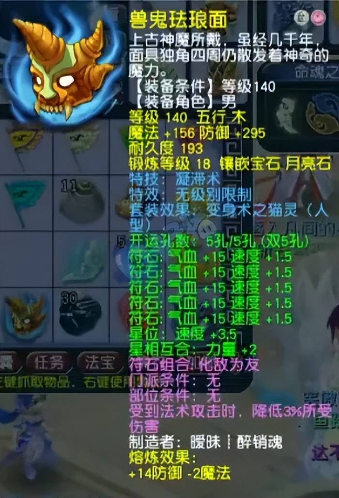 140级无级别凝滞男头,18锻月亮石+熔炼总防309。凝滞的效果是减少对手单体的速度属性,可以扰乱对手的封系出手节奏。
