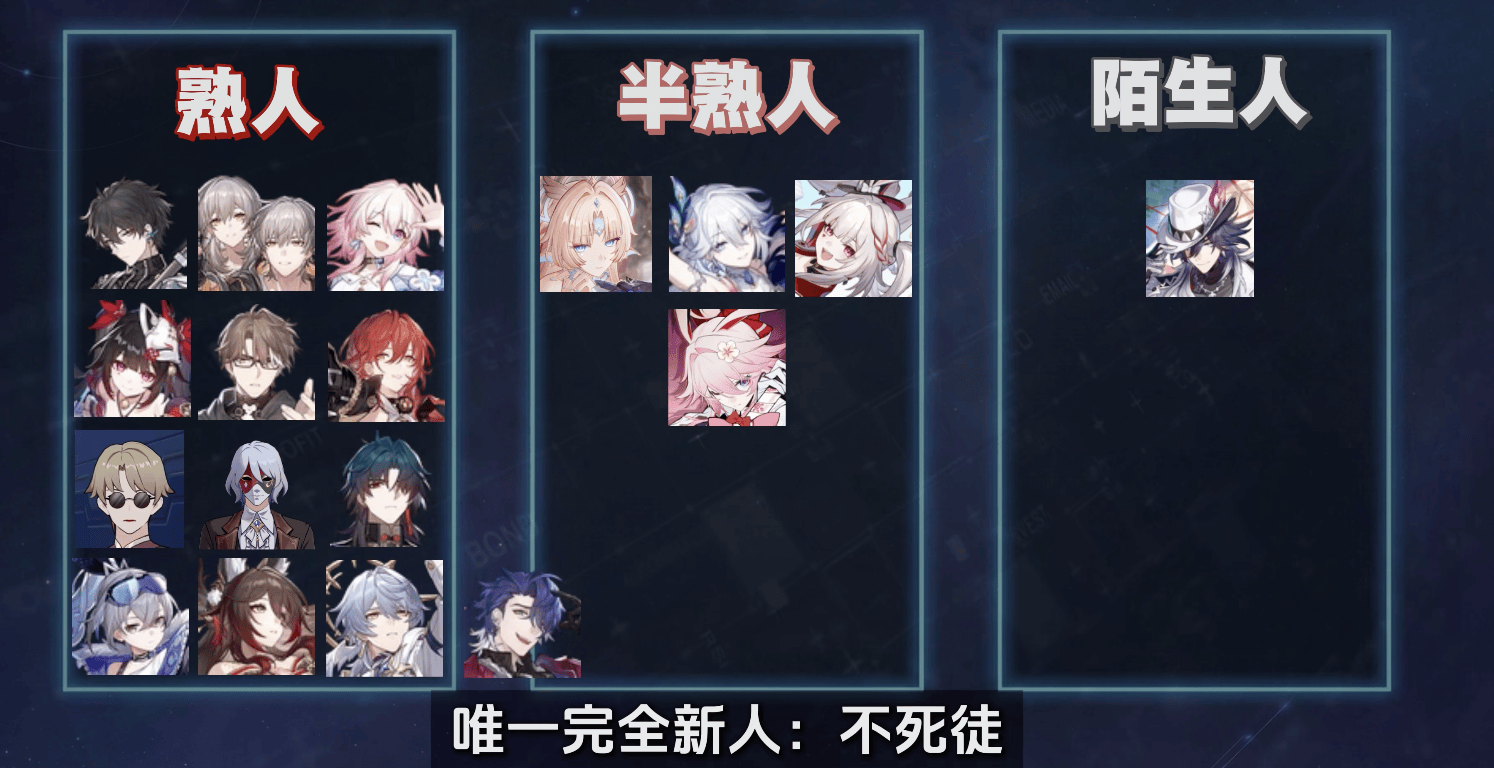 在二相乐园中,剧情里出现的角色几乎都是我们熟悉的,完全认识的角色有列车组全员,花火、星期日、银狼、停云、刃、桑博,NPC型角色有斯科特、乔瓦尼;半熟悉的角色,也就是在相关背景中出现过的角色有爻光、真珠、火花,还有个同位体角色绯樱,整个4.0版本全新的角色只有不死途一个。