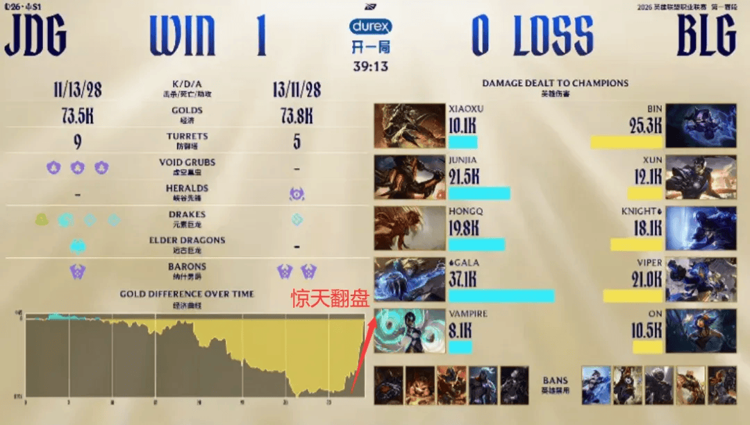 事实上这场BO5中双方的发挥也的确如此,BLG在对线阶段几乎是完爆JDG,只有Gala能勉强做到在线上稳住,第一局BLG在30分钟时就手握近6K的经济优势,结果却在大型资源团的决策上出现了巨大失误——选择用rush大龙来换JDG的电龙魂,这也为后续翻盘埋下伏笔。