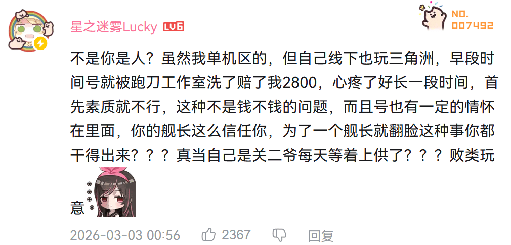 3月1日凌晨,清雨连续被指定了好几把,因为都是很难撤出来的角色心态有些崩,清雨的舰长“五月食伍”看到这种情况,主动给清雨准备了六套,并表示他想怎么玩都行,怎么开心怎么玩。但“五月食伍”忘了一件事——他的舰长在2月28日到期,扫码时间是3月1日凌晨,刚好到期。