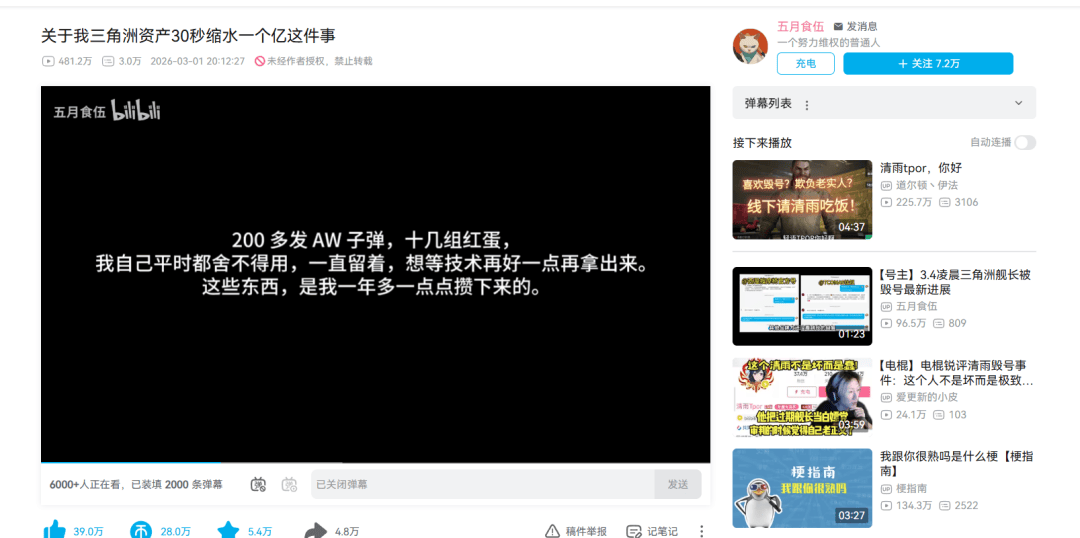 五月食伍看到清雨炉火纯青的毁号操作时整个人都是懵的,没想到自己舰长过期了这一茬,于是他在弹幕里开始说“这是我的号啊”,直到有人提醒他舰长过期了他才发现。当他想续费时候已经晚了,清雨在直播间内倒数十秒准备把所有装备卖出。姬友们要知道一点,任何网站的直播都是有延迟的,而十秒的时间让一个处于懵逼状态的人上舰长,时间完全不够。