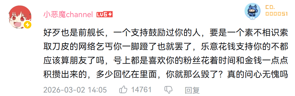 其实姬觉得毁号以后不说后面那些话的话,事情还不至于闹这么大,现在看起来,网友之所以愤怒,更多是因为支持者的好意因意外而造成了误会,清雨不但没有理解安慰,反而态度极度傲慢。