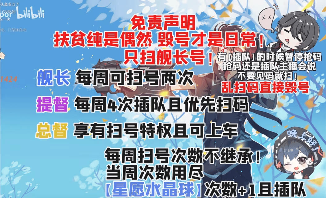 他直播时会和上面姬说的一样,上舰长就可以扫号。不过因为二维码直接放在屏幕上,所以有时候有一些不上舰的人也会扫码,于是清雨出了一个惩罚措施:发现非舰长扫码,直接毁号。