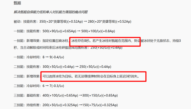 调整后的甄姬二技能新增一个效果,冰柱也能成为目标,可以和英雄或者小兵一起弹射,无法弹射也会在敌人身上留下3秒的印记,这就很厉害了,甄姬的二技能弹射打人很疼。甄姬新增的技能效果太过强势,作为平衡,策划降低了甄姬技能的基础伤害,特别是大招的基础伤害和持续性伤害,整体来说,甄姬还是增强,而且变得很强。