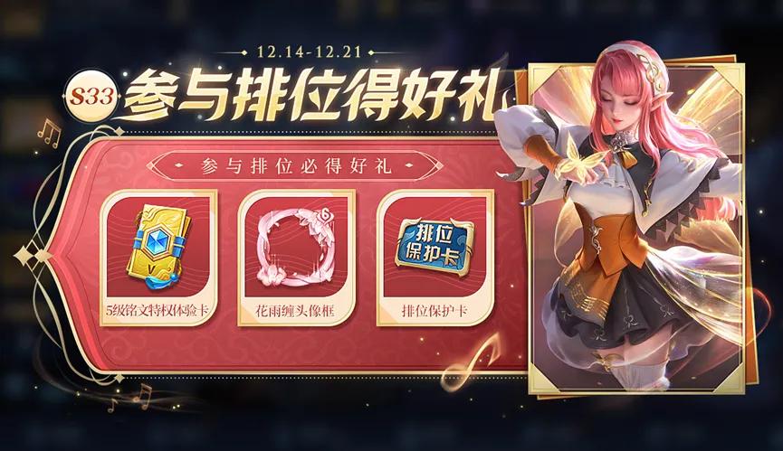 具体的奖励内容,参与一场排位赛,能够获得排位保护卡一张,五级铭文特权卡七天参与三场排位赛可以获得亲密度玫瑰,一个参与五场排位赛可以获得花语缠头像框自选宝箱。