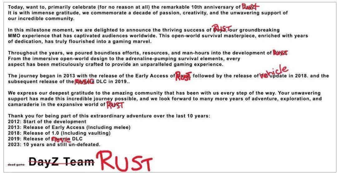 这个公告先是被同类游戏《DayZ》模仿恶搞了一遍,落款还有个被划掉的“死掉的游戏”
