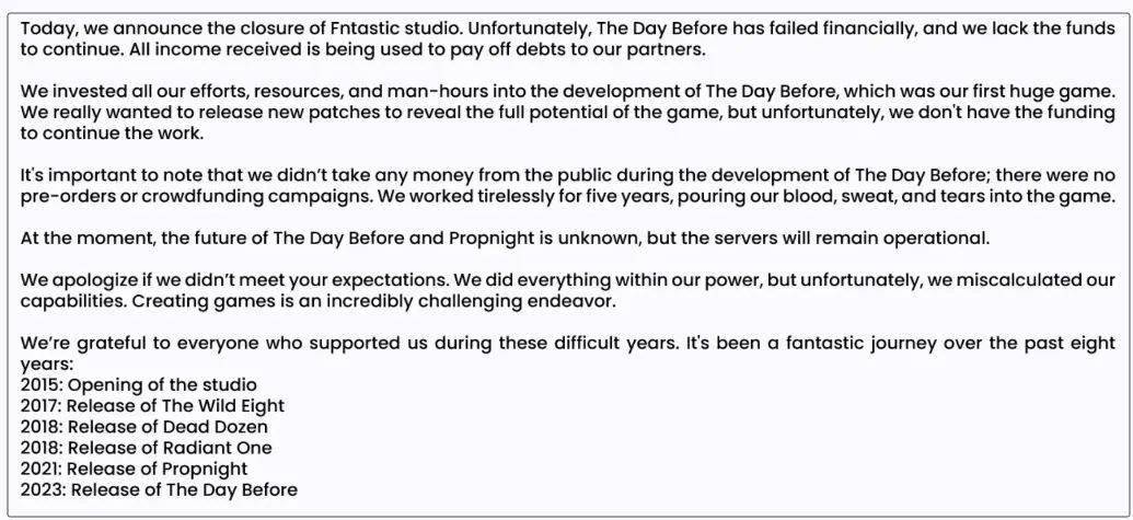 在大家都以为闹剧要落幕的时候,今天凌晨,重量级的才真正登场:开发商Fntastic突然宣布工作室破产,将不再开发游戏,因为《浩劫前夕》的商业成绩是场彻底的失败。他们所有的收入都将用来偿还债务,玩家可以退款,而至于开发商的其他游戏,则暂时没有公布退款渠道。
